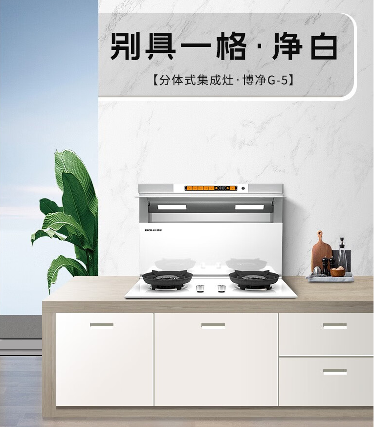 博凈分體式集成灶快吸煙、高排煙、更集成、更智能,戶型可以不同,吸油煙卻是相同的選擇,博凈分體式集成灶,布局、顏色百搭,秒變精致廚房。