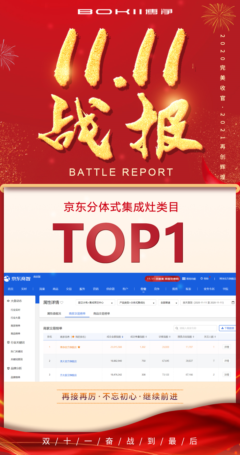 雙11大戰(zhàn)已經(jīng)完美落幕,在這場萬眾矚目的消費(fèi)盛宴中,博凈電器力壓群雄,在京東分體式集成灶類目里斬獲成交金額、總銷量均TOP1的喜人成績。這個(gè)雙十一驕人戰(zhàn)績,無疑展現(xiàn)了博凈分體式集成灶...